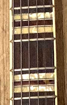 The fact that this guitar has a 5-piece neck is evident from this photo. The dealer's plate indicates that the guitar was purchased when new in the then West Riding of Yorkshire from a now sadly defunct retailer, Moores of Bradford, on North Parade.
