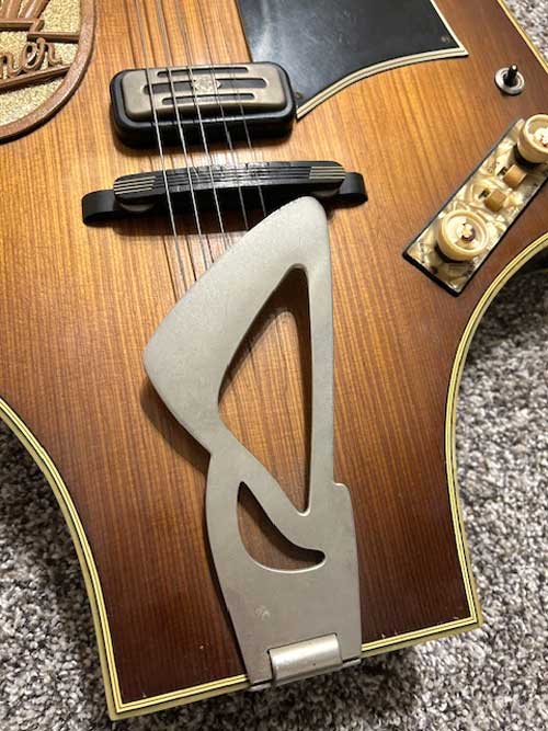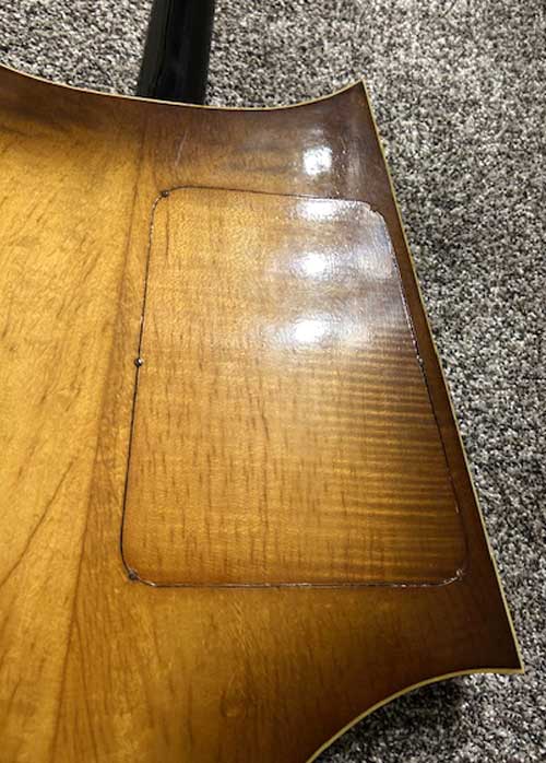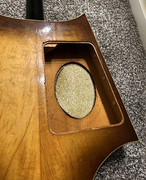 An empty body cavity, where the built-in amplifier and speaker was installed in some earlier Fledermaus guitars.