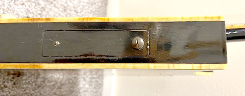 The lower body rim, showing the cover of the battery compartment for use when a built-in amplifier is installed.