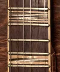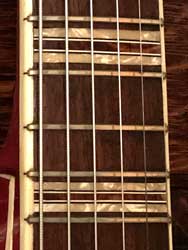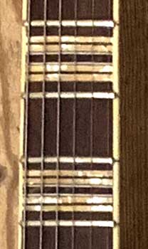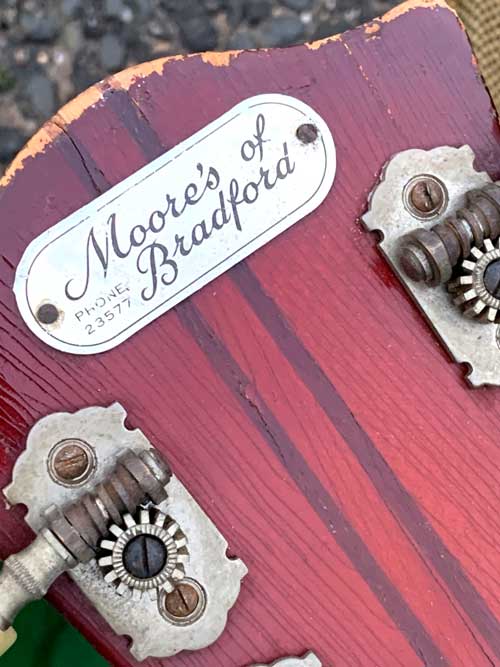 The fact that this guitar has a 5-piece neck is evident from this photo. The dealer's plate indicates that the guitar was purchased when new in the then West Riding of Yorkshire from a now sadly defunct retailer, Moores of Bradford, on North Parade.