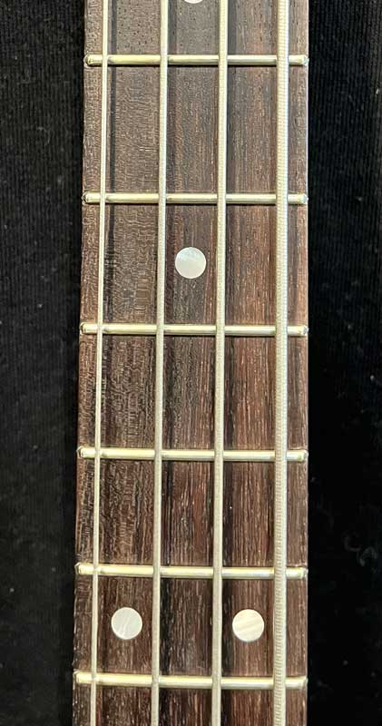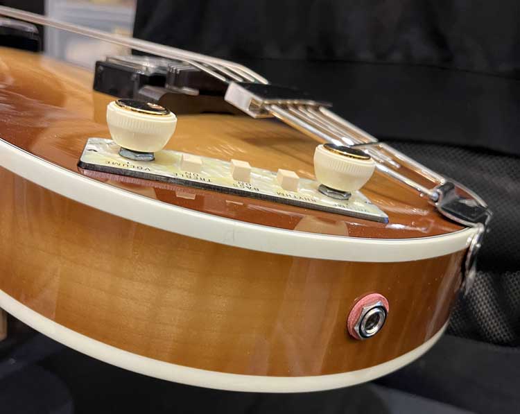 This photo illustrates some of the main features of the World History Premium guitars - the location of the jack socket, the lack of strap button, and the slightly raised tailpiece anchorage.