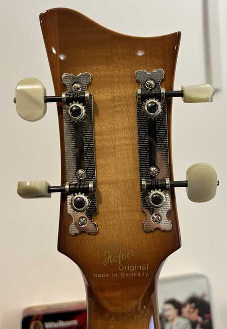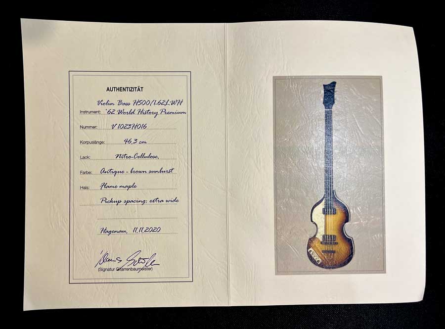 The guitar's Certificate of Authenticity, signed by Klaus Schoeller, the CEO of the Karl Hofner Company.