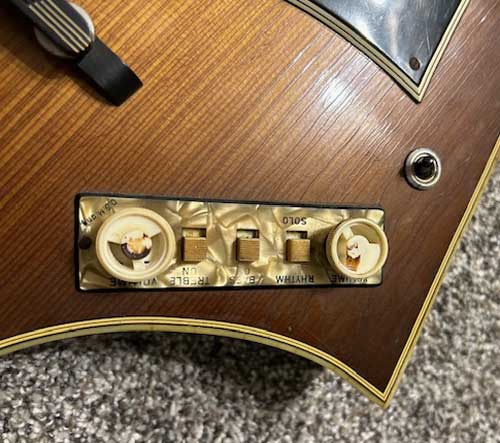 The top rim of the guitar's body, showing the ventilation holes required when a built-in amplifier is installed.