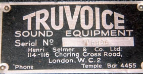 This equipment was supplied to Selmer by the RSA company who operated from premises on Flitcroft Street inf the Charing Cross Road area of London which was close to Selmer's base at 114 Charing Cross Road. RSA had actually been bought by the then Henri Selmer company in December 1947, who from then on developed the early RSA output into a more guitar-based range but still using the Truvoice brand name that RSA had being using previously on their equipment.
